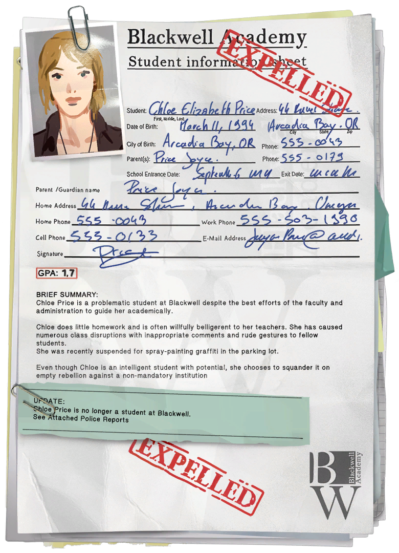 - ↑ Blackwell documents in both Chloe's and Alternative Chloe's rooms dated 2010 reveal that Chloe attended Blackwell Academy at least since then.