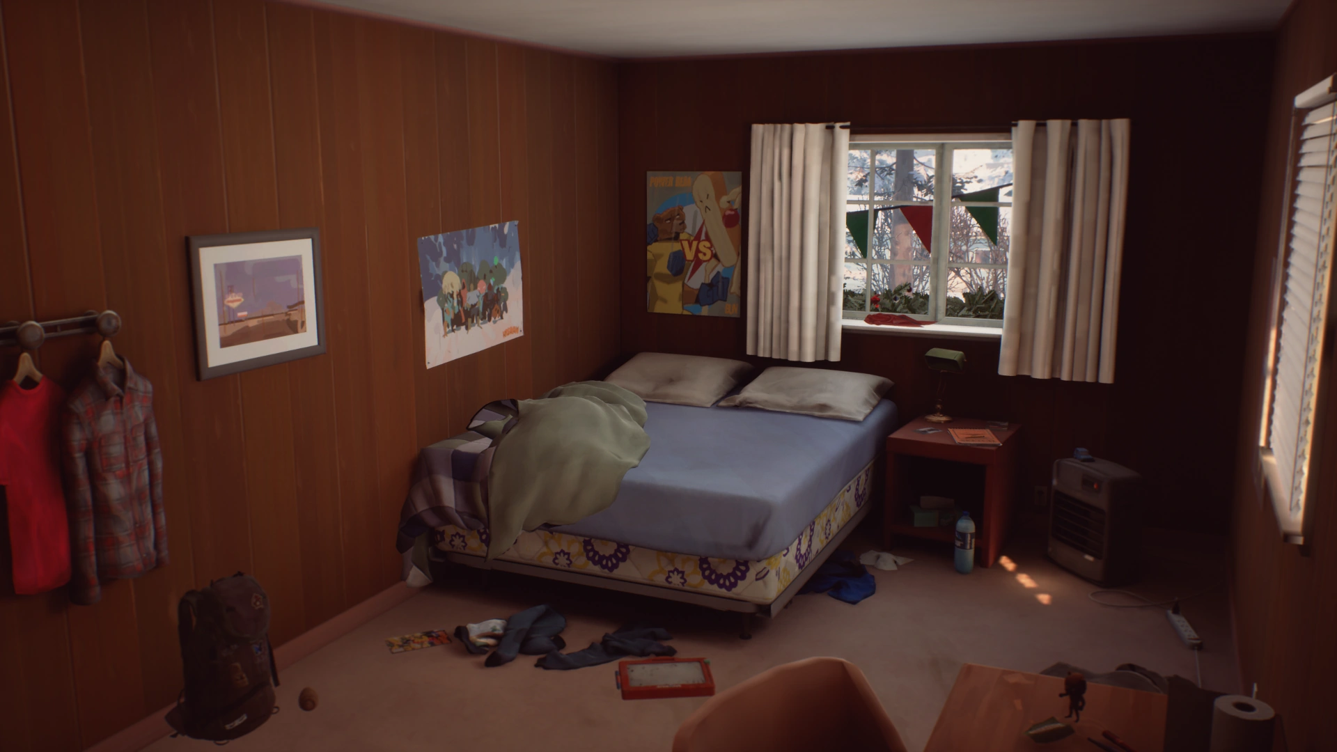 A week later, the room's walls have become adorned with various posters and comic book pages depicting Hawt Dawg Man and Power Bear. The space heater has been plugged into the outlet strip, and piles of dirty clothes lie around the bed alongside Daniel's Draw-A-Lot tablet. On the dresser are the reading lamp, the photo of Esteban, the sketchbook, and one of Stephen's crime novels, with a water bottle placed in front of the dresser and the tissue box having been moved underneath it. Several toys are scattered around the room, including miniature cars, building blocks, and a space toy. The pair of dice from Sean and Daniel's Ship, Captain, and Crew game from the abandoned house lies on the desk alongside a pair of earmuffs and (if they won one from Bear Station) Daniel's chibi Power Bear toy. Mushroom's bandanna sits on the bedroom's windowsill.