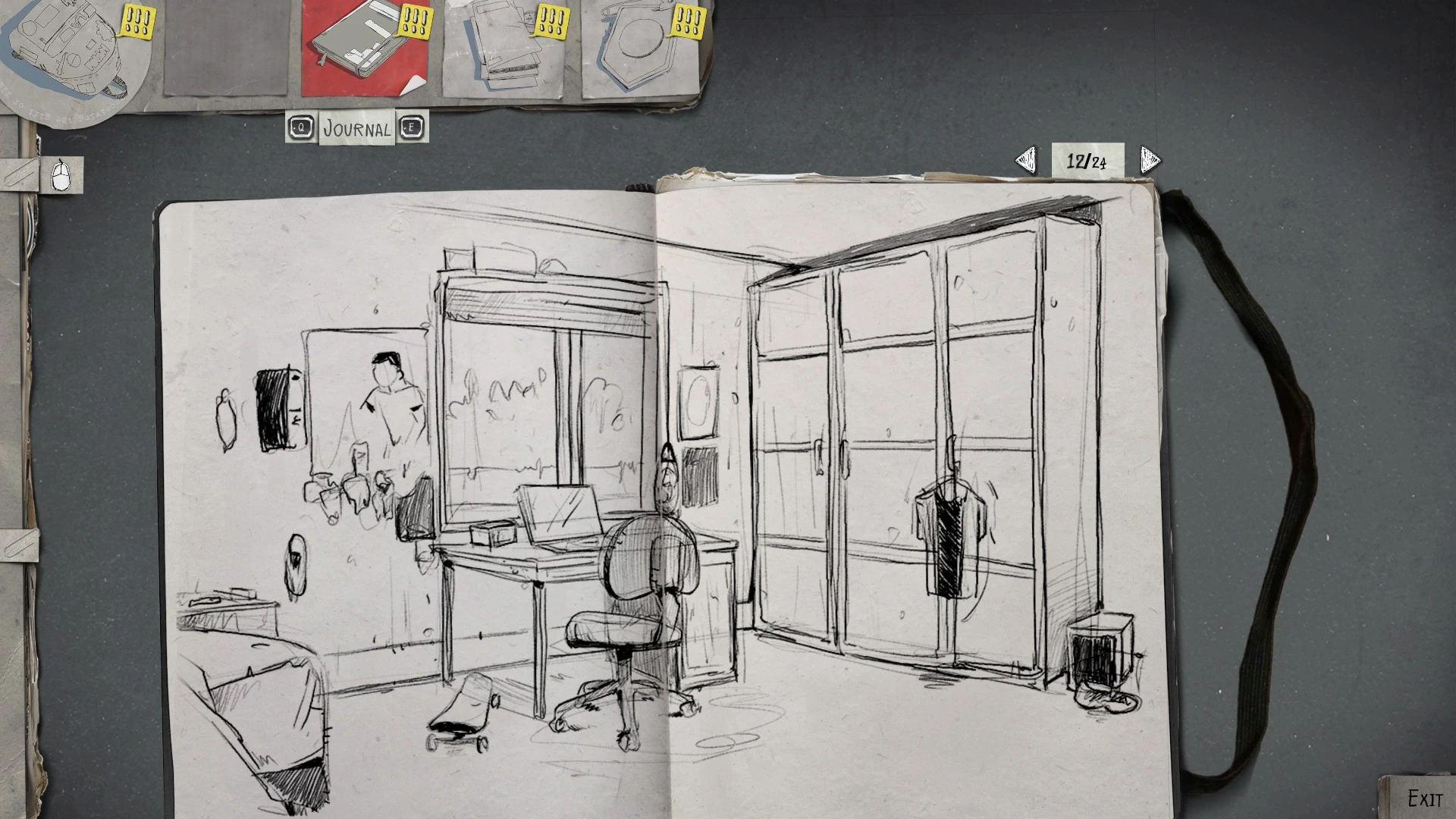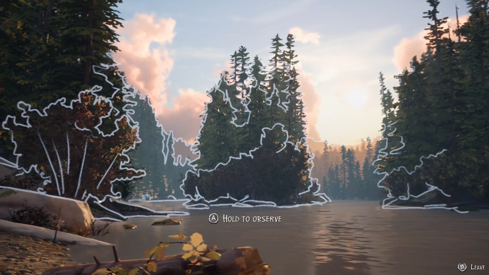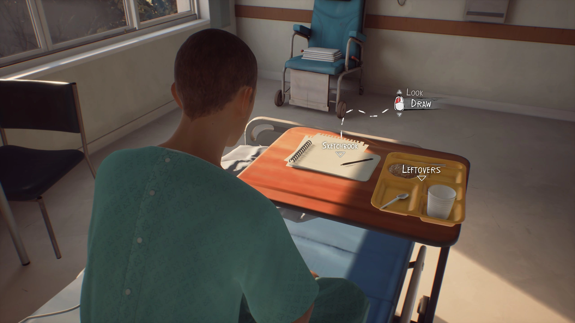 The drawing mechanic consists of two phases; observation and sketching. First, the player must take in their surroundings and memorize its details, which involves pointing the camera at a specific part of the scenery and holding down the A, X, or left mouse button. Next, the player must look down at their journal and sketch out the scene by moving their control stick or mouse until the sketch is done. This process is repeated several times, as the player's surroundings come into focus and their sketches become more detailed, until the drawing reaches its maximum detail variant.