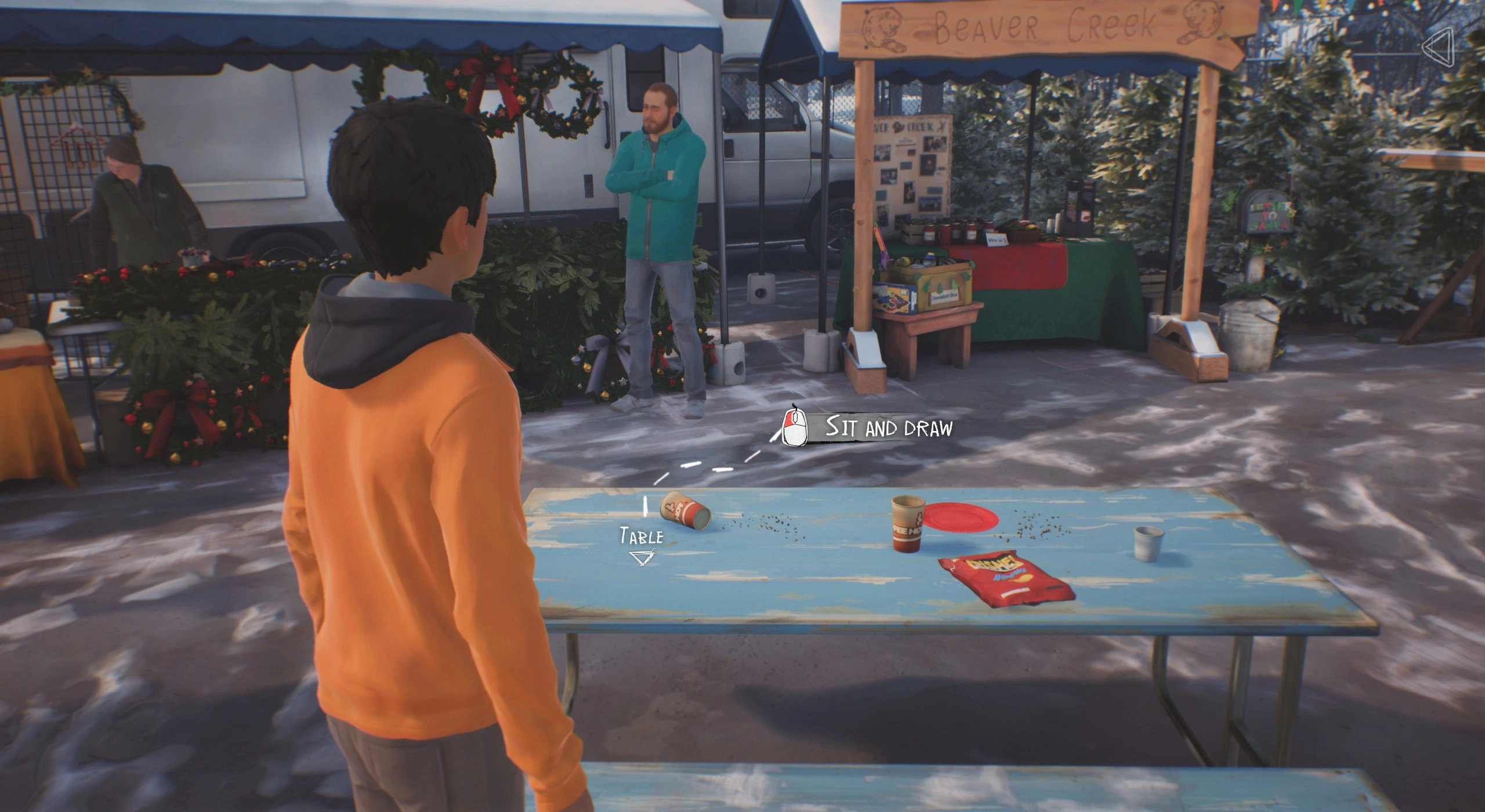 Sean can sit on a bench in the Christmas Market and draw the scene. After completing the sketch, Chris will walk up to Sean and ask to add something cool. Sean decides on adding either a UFO or zombies. |